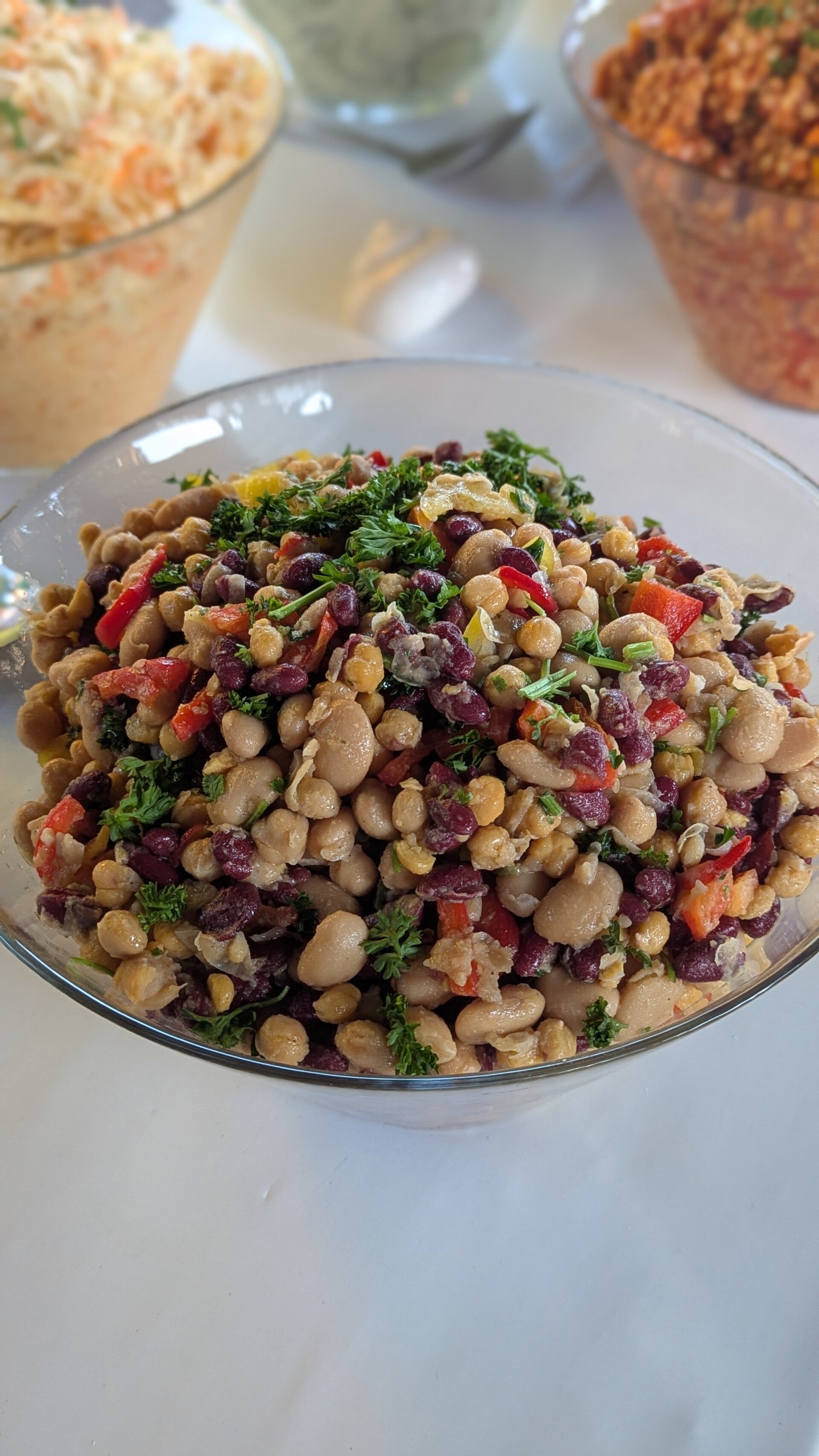 Frischer mediterraner Bohnensalat aus zarten weißen Bohnen, knackiger Paprika, aromatischen Zwiebeln und einer Prise frischer Kräuter.