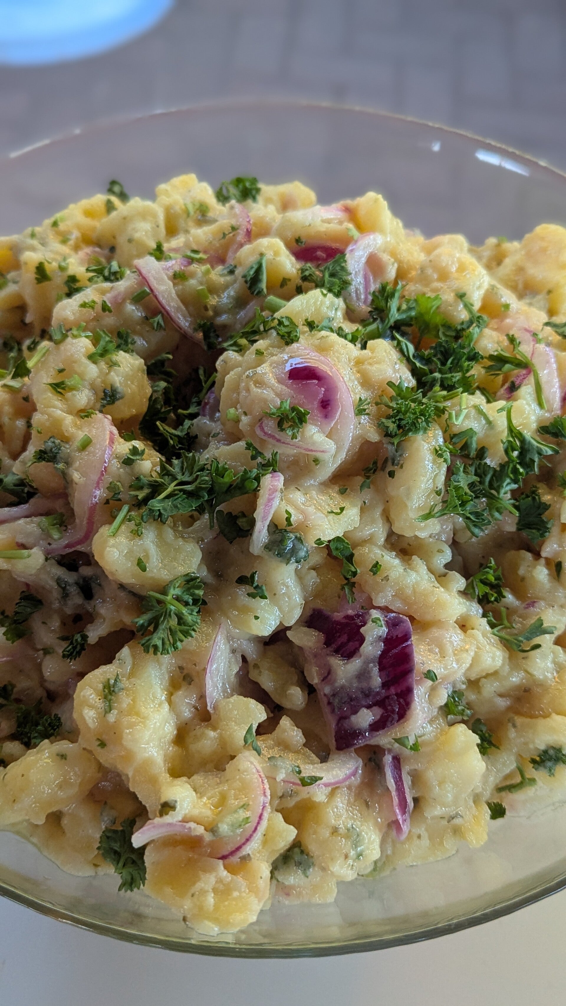 Unser hausgemachter Kartoffelsalat mit knackigen Zwiebeln und frischen Kräutern – ein Genuss für jeden Anlass.