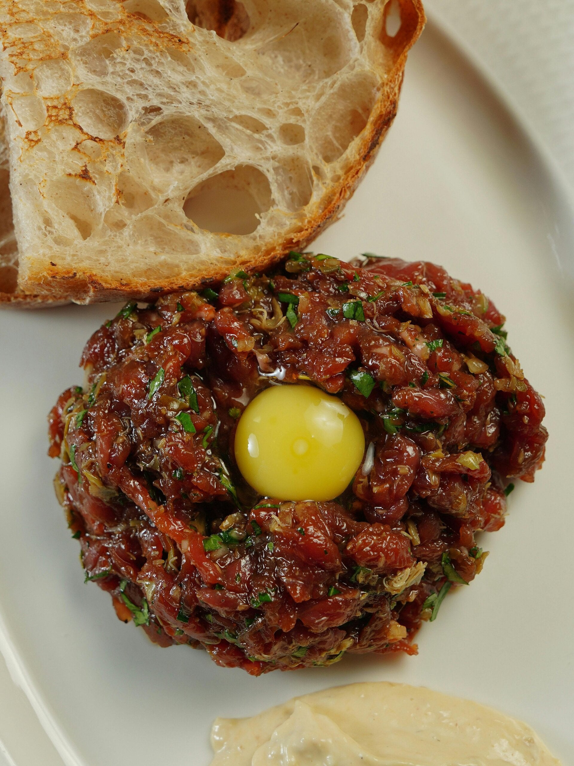 Fein gehacktes Rinderfilet, aromatisch abgeschmeckt mit Zwiebeln, Kapern und Gewürzen, serviert mit einem frischen rohen Ei und knusprigem Brot – ein unvergleichlicher Genuss für Liebhaber klassischer Vorspeisen.